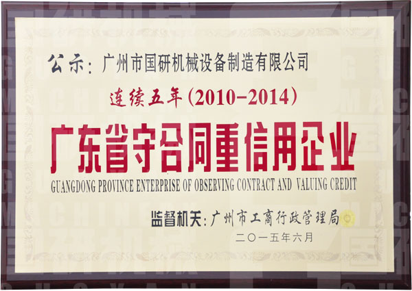 “连续五年(2010-2014)广东省守合同重信用企业”的牌匾在广州市国研机械设备制造有限公司的文化展示墙上格外引人注目,这是对公司多年坚持诚信经营的充分肯定,也是公司企业文化“诚信、创新、分享、精进”的客观体现。