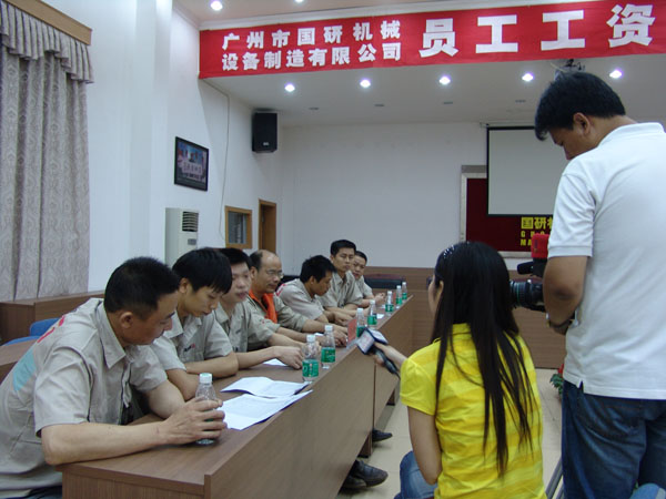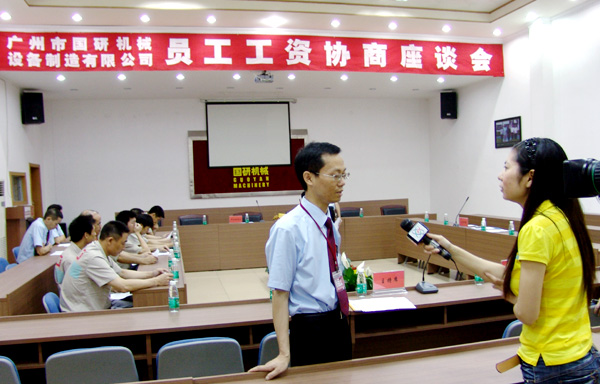 5月14日晚9:30分,中央电视台新闻频道“新闻1+1’ 节目以《工人工资到底怎么才能涨?》为题重点披露富士康等企业在工人工资方面存在的种种问题,同时正面报道了广州国研机械通过建立员工工资集体协商机制解决员工工资问题的先进经验。