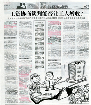 7月14日,《南方日报》以《工资协商谈判能否让工人增收?——国研公司实践的工资协商谈判或是突破》为题,用三分之二大版篇幅报道广州市国研机械设备制造有限公司实践工资集体协商的成功经验。